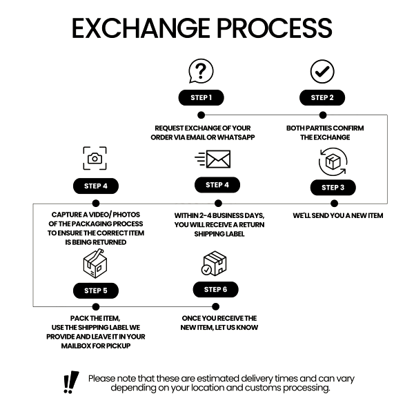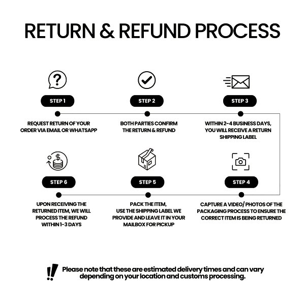 After verifying your return request, we’ll send you a return shipping label for the return in 2-4 days. To ensure a smooth return process, kindly capture a video or photos of the packaging process to ensure the correct item is being returned before you send it back. The courier will then pick up the return package from your shipping address or you send your return package to our address via a postal service. We will send you our address through email or WhatsApp.